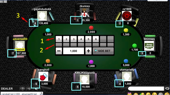 Jika nomer meja berkedip berarti ada yang mengajak anda adu samping/sidebet dan jika anda setuju tinggal klik nomer mejanya dan jika tidak ingin adu samping abaikan saja. Taruhan samping dianggap sah apabila di meja sudah keluar bendera. |