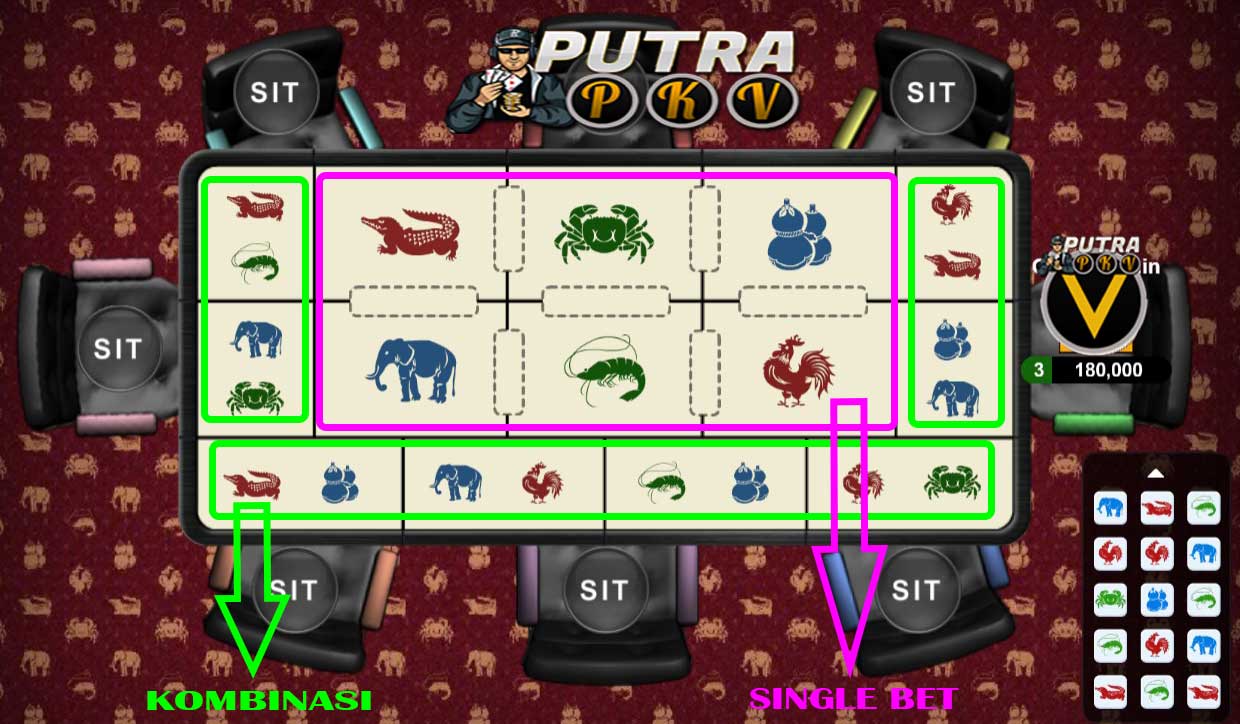 1. Dalam 1 ronde permainan dadu koprok, pemain bisa menempatkan 3 koin pilihan (bisa ditempat yang sama) 2. Pemain bebas menempatkan pilihan: - single bet = memilih salah satu gambar - kombinasi = memilih bagian gambar yang memiliki 2 gambar Nilai kemenangan ditentukan dari hasil kocokan dadu gambar - SINGLE BET Kemenangan dibayar 1x nilai taruhan bila muncul gambar yang dipilih pemain. Bila hasil kocokan dadu memiliki 2 gambar yang sama, maka dibayar x2 nilai taruhan. Dan bila muncul 3 gambar yang sama dengan pilihan pemain maka kemenangan dibayar 3x nilai taruhan Anda. Contoh : Bila pemain memasang gambar KEPITING, hasil dadu koprok muncul : ~ GUCI / AYAM / KEPITING = maka kemenangan dibayar 1x ~ GUCI / KEPITING / KEPITING = maka kemenangan dibayar 2x ~ KEPITING / KEPITING / KEPITING = maka kemenangan dibayar 3x - KOMBINASI BET Kemenangan dibayar x5 dari nilai taruhan bila kombinasi gambar yang dipilih muncul pada kocokan dadu koprok. Bila kombinasi gambar yang dipilih muncul pada ketiga hasil kocokan maka kemenangan dibayar x7 dari nilai taruhan. Contoh: Bila pemain memasang GUCI / KEPITING, hasil dadu koprok muncul: ~ GUCI / KEPITING / AYAM = maka kemenangan dibayar x5 ~ GUCI / GUCI / KEPITING = maka kemenangan dibayar x7 ~ GUCI / KEPITING / KEPITING = maka kemenangan dibayar x7 Posisi bettingan pada permainan bandar dadu koprok: Dalam memasang taruhan yang anda inginkan, pemain cukup melakukan klik pada gambar yang diinginkan, pada gambar dibawah bisa anda lihat secara detail dimana gambar pilihan untuk memasang: - 1 gambar memiliki 6 jenis pilihan, - 2 gambar memiliki 15 jenis pilihan yang kami beri tanda pada gambar panduan yang telah disediakan di atas. |