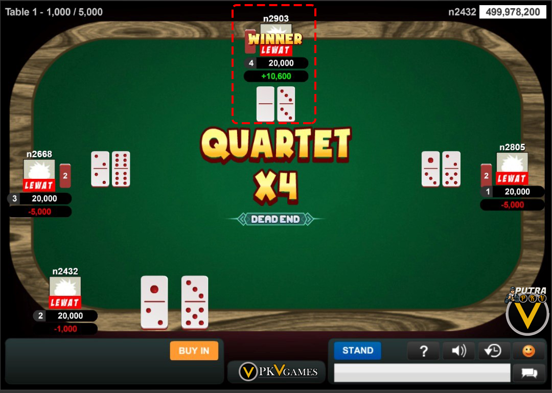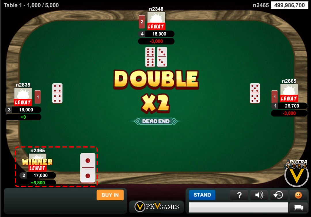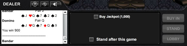 Pada awal permainan saat anda didalam meja taruhan semua pemain akan diwajibkan memasang taruhan di tengah sesuai nilai bet meja yang anda mainkan. Setelah itu pemain akan dilakukan pengocokan buah dadu yang akan ditampilkan di meja taruhan anda. ~ Pemain bisa melakukan kocok ulang (bisa memilih dadu mana yang mau dikocok ulang) bila merasa nilai dadu yang didapat kurang memuaskan, akan tetapi perlu membayar lagi sesuai nilai meja dalam taruhan. ~ Bila pemain merasa nilai dadu yang diperoleh sudah bernilai bagus, maka pemain cukup mengklik CHECK dan tidak perlu membayar taruhan lagi. ~ Pemenang akan diambil sesuai dengan nilai tertinggi dalam peraturan perang dadu wars (lihat tabel) ~ Bila ada 2 atau lebih pemenang maka nilai kemenangan akan dibagi dua atau dibagi rata. |