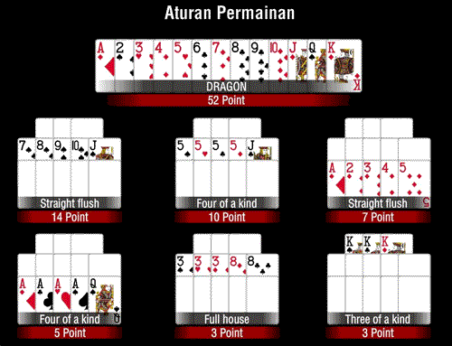CONTOH : Kartu A,A,A,2,2 dengan warna daun yang beda - Untuk warna daun yang sama tapi angka tidak sama disebut dengan istilah Warna (Flush) CONTOH : Kartu 5,8,10,J,K dengan warna dan daun yang sama - Untuk angka yang berbeda tetapi berurutan disebut dengan istilah Seri (Straight) CONTOH : Kartu A,2,3,4,5 atau 10,J,Q,K,A tetapi dengan warna daun yang tidak sama - Untuk 3 Kartu yang sama dengan kombinasi 2 kartu yang berbeda disebut dengan istilah Tris (Trees) CONTOH : Kartu A,A,A,2,3 dengan warna daun yang berbeda - Untuk 2 kartu yang sama dengan kombinasi 3 kartu yang berbeda disebut Kembar (Pair) CONTOH : Kartu A,A,2,3,4 dengan warna daun yang berbeda Cara permainan capsa susun harus disusun berurutan seperti tingkatan ketiga atau susunan paling bawah harus lebih besar dari tingkatan kedua atau susunan ditengah. Untuk tingkatan paling atas atau tingkatan pertama harus mempunyai angka yang lebih besar dari lawan misalkan player A mempunyai angka kartu A,A,2 dan player B mempunyai kartu K,K,2 makanya untuk hitungan susun diatas dimenangkan oleh player A. Contoh keterangan nomor 1,2,3 diatas dan seterunya adalah susunan kartu dari terbesar hingga susunan kartu paling terkecil dalam susunan permainan capsa susun online. Untuk setiap kemenangan akan dihitung dari perkalian meja yang anda mainkan. Setiap hitungan berbeda beda dari setiap susunan tingkatan |