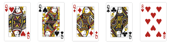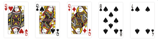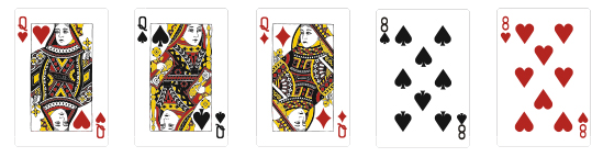 Merupakan urutan kartu kombinasi 4 kartu kembar dan 1 kartu samping sebagai "kicker". - Bila player lain juga memiliki kartu Four of a Kind maka player yang memiliki kartu kembar 4 tertinggi yang jadi pemenang di atas meja judi poker online. - Dan jika kartu kembar 4 yang ada diatas meja (community cards), maka player yang memiliki kartu kelima ("kicker") tertinggi yang menang.