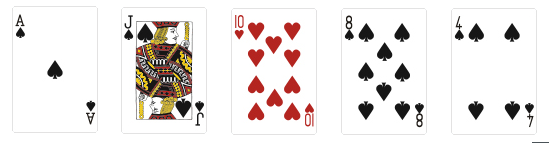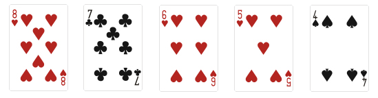 Merupakan kombinasi 5 kartu secara berurutan tanpa melihat corak / motif kartu. - Bila pemain lain juga memiliki kartu Straight maka pemenang ditentukan dari nilai kartu tertingginya. - Kartu AS dapat diposisikan sebagai nilai kartu tertinggi maupun nilai kartu terendah, contoh:
