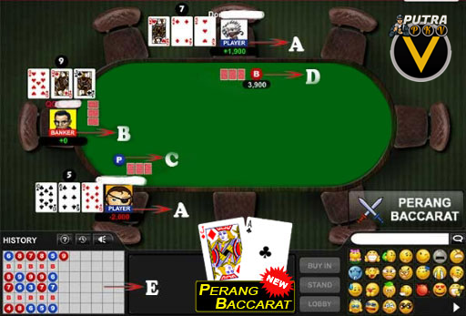 Perang baccarat merupakan permainan terbaru dari server pkv games. Judi Perang baccarat dapat dimainkan oleh 2 sampai 8 pemain. Pada permainan perang baccarat ini terdapat 1 pemain yang menjadi banker. Setiap pemain akan mendapatkan giliran menjadi banker jika memenuhi syarat tertentu. ![]() KETERANGAN GAMBAR : A = Pemain dalam permainan dengan posisi sebagai PLAYER B = Pemain dalam permainan dengan posisi sebagai BANKER C = Warna biru saat pemain membeli kartu Player (P) D = Warna merah saat pemain membeli kartu Banker (B) E = Catatan pemenang dalam permainan (Bola merah untuk Banker / Bola biru untuk Player) Perhatikan Pada Contoh Gambar Yang Di Atas : 1. Pada gambar diatas adalah kartu Banker mendapatkan nilai 9.