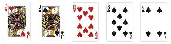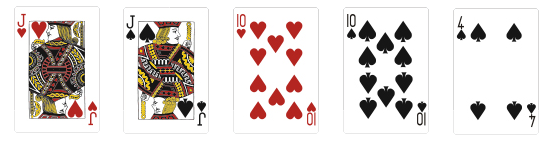 Merupakan kombinasi 2 kartu kembar dengan 2 kartu kembar lain yang berbeda ditambah dengan 1 kartu samping (kickers). - Bila beberapa player memiliki kartu Two Pair maka pemenang dengan 2 kartu kembar dengan nilai tertinggi yang menjadi pemenang. - Bila masih imbang maka kartu kembar kedua yang menjadi patokan siapa yang menjadi pemenangnya. - Bila masih imbang lagi maka pemenang dengan kartu samping (kickers) tertinggi yang menjadi pemenang.