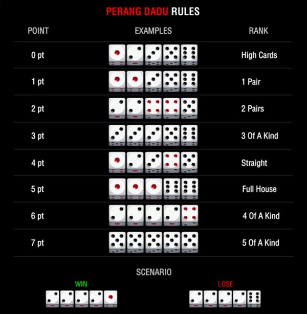 1. Jika dari ke-5 dadu memiliki 1 pasang nilai kembar maka dihitung: 1 poin 2. Jika dari ke-5 dadu memiliki 2 pasang nilai kembar maka dihitung: 2 poin 3. Jika dari ke-5 dadu memiliki 3 pasang nilai dadu yang sama maka dihitung: 3 poin 4. Jika dari ke-5 dadu memiliki nilai 1,2,3,4,5 secara berurutan (straight) maka dihitung: 4 poin 5. Jika dari ke-5 dadu memiliki 3 pasang nilai dadu yang sama dengan 2 pasang nilai yang sama (FullHouse) maka dihitung: 5 poin 6. Jika dari ke-5 dadu memiliki 4 pasang nilai dadu yang sama maka dihitung: 6 poin 7. Jika dari ke-5 dadu memiliki 5 pasang nilai yang sama maka dihitung: 7 poin NB: Pemain yang mendapat poin nilai tertinggi yang menjadi pemenang dalam permainan perang dadu. |