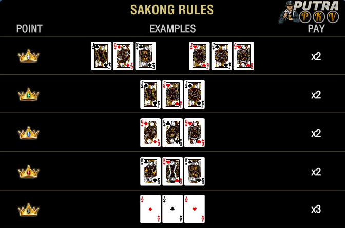 Sakong bisa juga di sebut permainan 3 Picture (3 Gambar) Dan semua pemain bisa menjadi BANDAR dalam permainan. Permainan sakong hanya mengunakan 3 kartu remi saja dan dapat dimainkan dengan jumlah 8 orang pemain dan salah satu pemain akan menjadi bandar dalam permainan. - Dalam permainan sakong qq, kartu yang yang terbesar adalah kartu yang berjumlah 10 atau 20 atau 30 dan kartu yang terkecil adalah kartu yang berjumlah 1 - Dan untuk kartu King (K), Queen (Q) dan Jack (J), dihitung 10 atau 0 (nol), untuk kartu 10 akan dihitung 10 (sepuluh) atau 0 (nol) - Sedangkan kartu AS dihitung 1 (satu) / 11. Setelah semua pembagian kartu selesai maka kartu player akan di adu dengan kartu milik bandar. Urutan Kartu Tertinggi Game Sakong QQ Online: